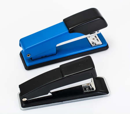 Black stapler and staples that have been used in the office for a long time. Black stapler and staples on white background with copy space. Old staff of the office and valuable personnel concept.