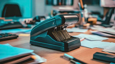 A close-up view of a black stapler positioned on a cluttered office desk filled with papers and stationery items, showcasing an organized yet busy workspace.