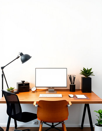 Modern workspace with computer, supplies and copy space on white wall. Mock up