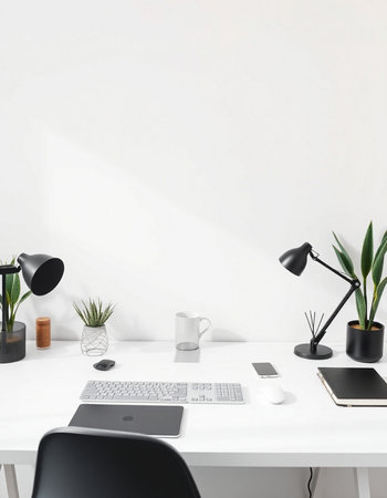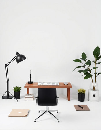 Modern office desk with black chair, computer keyboard and plant on white wall
