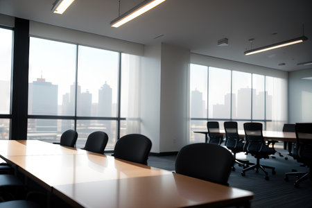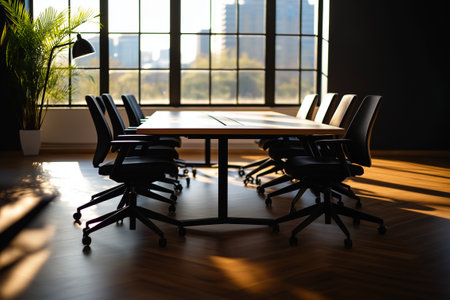 A Modern office interior with large conference table, black chairs, and natural light streaming through large windows. serene workspace for collaboration and meetings