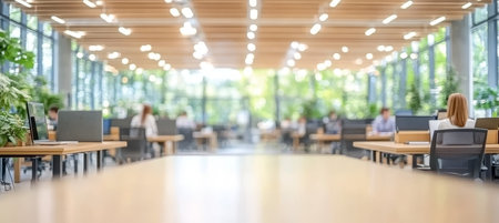 Modern Open Space Office With Natural Light and Greenery, Blurred Background For Business Concept.