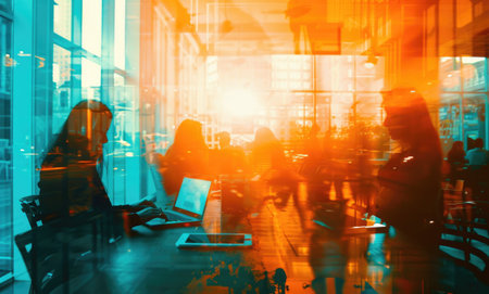 Motion blur captures the dynamic atmosphere in a bustling co-working space filled with professionals and entrepreneurs