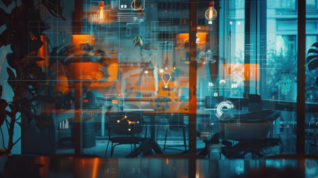 An office interior with a modern design is seen through a window overlayed with digital data, charts, and graphics. The room is empty and uncluttered, featuring a large window and a table with chairs. Light illuminates the room from the ceiling, creating a bright and inviting atmosphere.