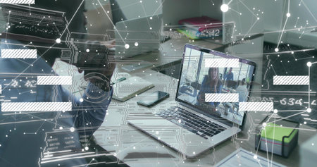 Blazer-clad woman holding smartphone and focusing on laptop at desk with data overlay, copy space. Technology, collaboration, remote work, digital communication, professional, modern, teamwork
