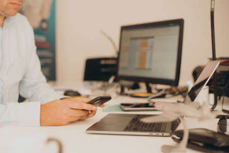 Close-up view of young professional businessman using smartphone while working on his project