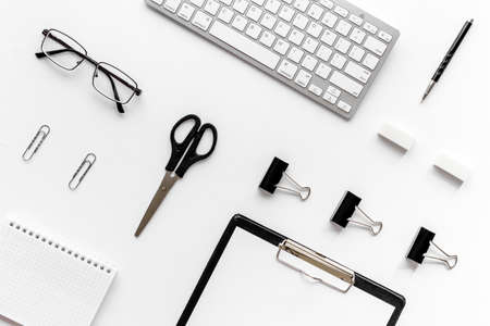 Work from home. an office desk with a clean notepad, pen, and glasses on a white desk. Flat space for copying the top view. Flat lay. High quality photo