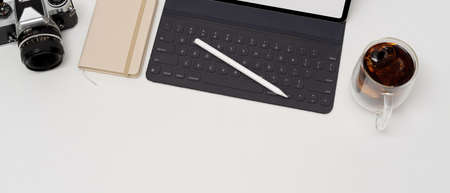 Cropped shot of simple worktable with digital tablet, coffee cup, diary book, camera and copy space