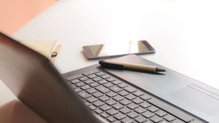 Laptop, pen and office supplies on office desk