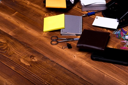 set of stationery for office: notebook, phone, scissors, clips, pen, box with blanks, wallet, rubber band, hole puncher, calculator, pin, stickers on vintage wooden background, side view, copy space