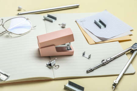 Stapler with different stationery supplies and eyeglasses on yellow background
