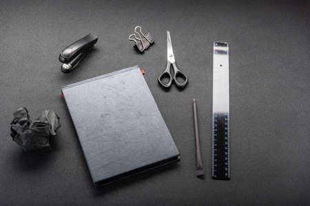 Black office supplies on a black table. Black ruler and black notebook.
