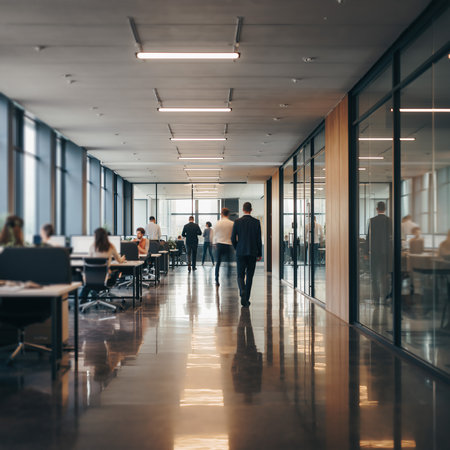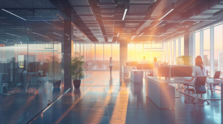 Modern office environment bustling with professionals engaged in various tasks during the daytime