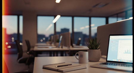 Side view of a modern office desktop with a laptop and a coffee cup. Blurred cityscape in the background