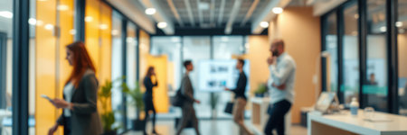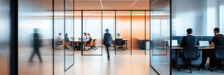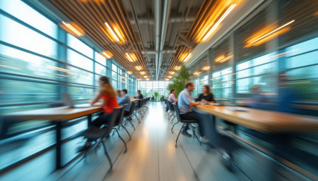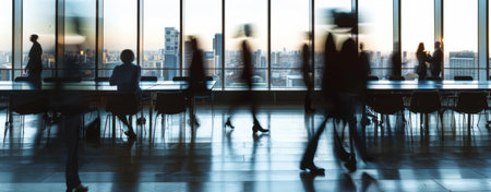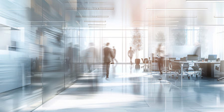 A bright and modern office with people walking in blurred motion highlights the dynamic, fast-paced energy of a professional workplace, emphasizing collaboration, innovation, and sleek interior
