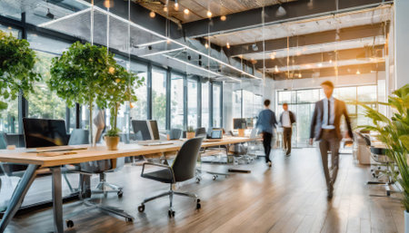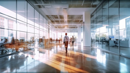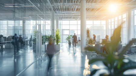 A contemporary office featuring a bright, well-lit atmosphere, where professionals walk in blurred motion, symbolizing dynamic workflows, collaboration, and the vibrant energy of a productive