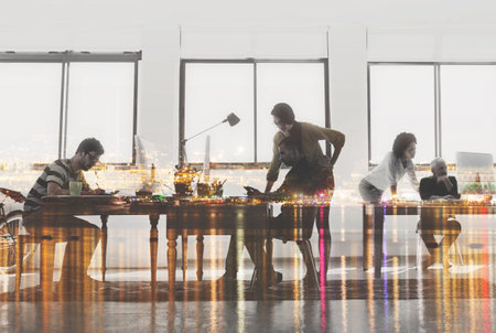 Diverse employees silhouettes walking in business coworking space, long exposure effect. Blurred busy professional workers, start up office staff workday, work rush concept, wide shot