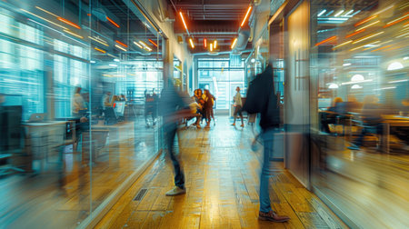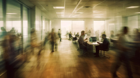 Motion blur captures the dynamic atmosphere in a bustling co-working space filled with professionals and entrepreneurs
