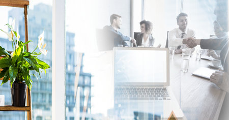 Composition of happy diverse business team shaking hands in meeting room with motion blur. global business, partnership and success concept digitally generated image.