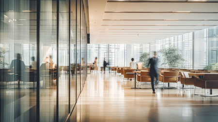 Blurry movement of people walking in the office. workstations and private meeting areas