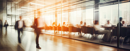 Office workers are seen as blurs of motion, actively working and moving in a modern open plan corporate office, conveying a sense of teamwork and productivity
