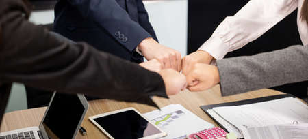 Businesspeople teamwork group putting their hands together agreement plan in meeting room, investment concept, success concept