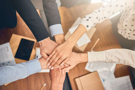 Top view of business team put hands on each other. Conference room with executive manager accountant and employee. Good deal and financial report. Papers with diagrams on wooden table