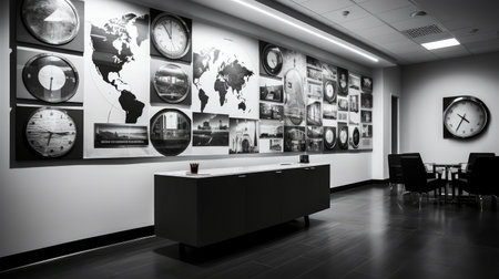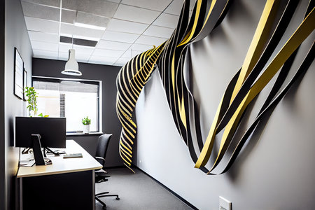 Modern office interior with a black wall, white and geometric decoration on the right side of the photo. Wooden floor, glass door, mock-up for design or presentation. --ar 3:2 --v 6.1 Job ID: faad352b-a716-4929-8a99-c788ffb7bc1a