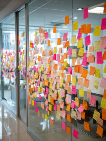 A vibrant wall filled with colorful sticky notes in a modern office space, ideal for showcasing creativity, organization, and brainstorming in a collaborative environment.