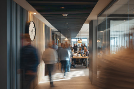 This image presents a blurred view of several people navigating a well-lit office hallway. The composition features a long corridor with vertical wall textures and a clock. Soft lighting and a shallow depth of field create a sense of movement. Suitable for illustrating business operations, workplace environments, and various commercial projects.