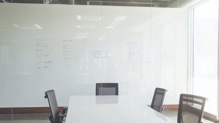 This image captures a modern conference room featuring glass walls and a minimalist design. Ideal for professional meetings and collaboration, it promotes creativity.