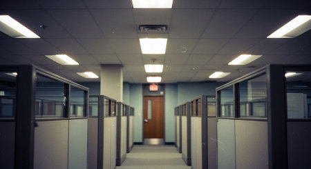 A modern office interior with cubicles, bright lighting, and a door at the end of the hallway
