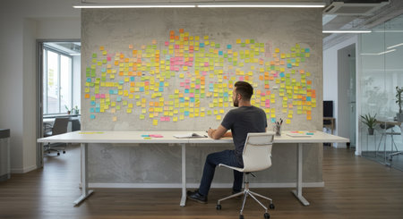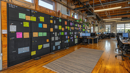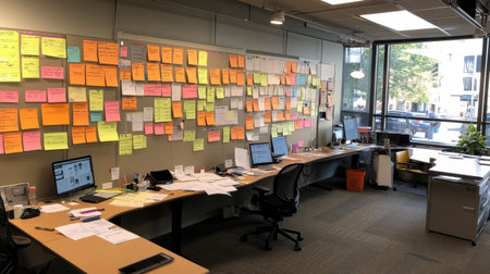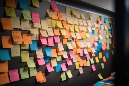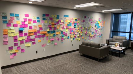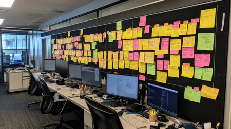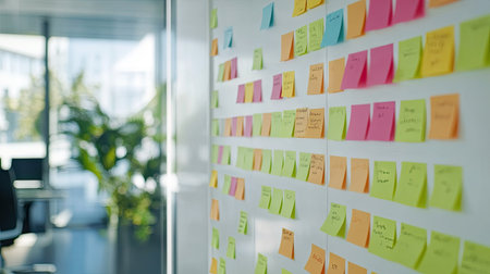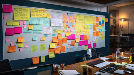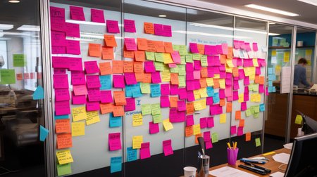 A vibrant display of sticky notes in a modern office, highlighting collaboration and planning efforts. This image captures the essence of teamwork and creativity in project management.
