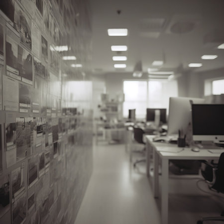A blurry view of a modern office space through glass doors. Soft background
