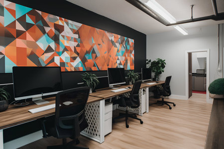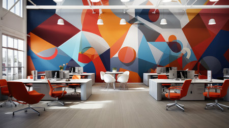 Discover a vibrant and colorful modern office that promotes creativity and collaboration. Featuring ergonomic desks, dynamic artwork, and lush plants for inspiration.