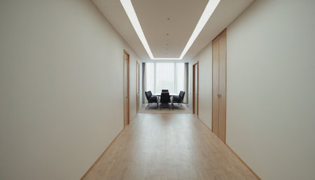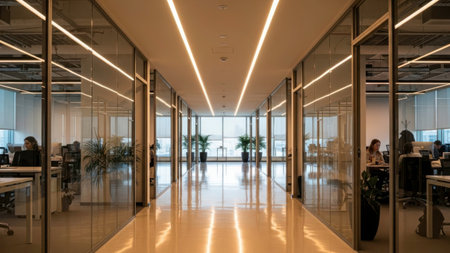 A sleek office corridor features glass walls and warm wooden accents, highlighting a stylish workspace with a focus on collaboration and modern technology, perfect for productivity.