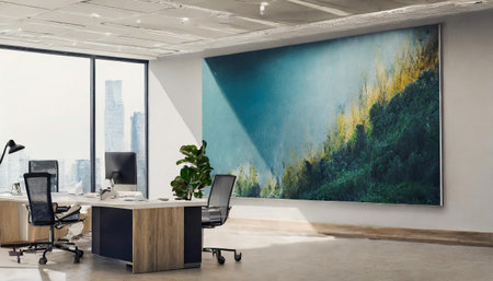A blurred office background with vibrant artwork, ergonomic workstations, and large windows, creating a lively and inspiring work environment.