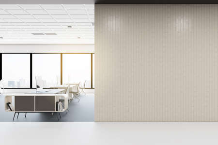 Interior of modern office building with white walls and glass doors. 3d rendering