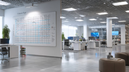 Bright and spacious modern office interior featuring a collaborative workspace, whiteboard area for planning, and contemporary design elements fostering creativity.