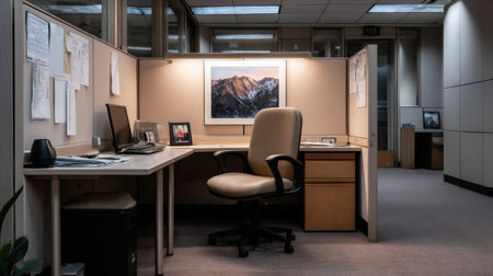 A cubicle office with a desk and chair. A framed picture of mountains hangs on the wall