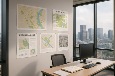 Modern office with city maps and urban planning documents hanging on the wall, desk with computer and notebook in the foreground and city view from the window
