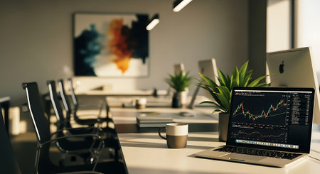 A contemporary office setting with a laptop displaying a stock chart, a cup of coffee, and potted plants on a long conference table.