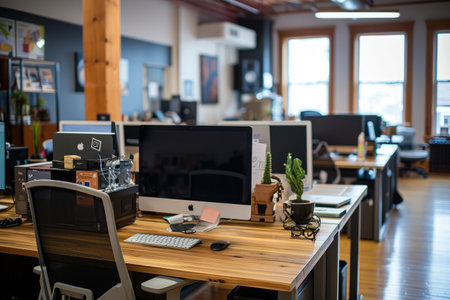 A wooden desk featuring two computer monitors, perfectly suited for enhancing productivity in the workspace, A typical tech company office filled with modern accents, AI Generated