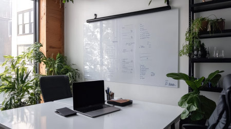 This image showcases a modern office workspace featuring a laptop, a whiteboard filled with notes, and lush green plants, creating an inspiring and productive environment.