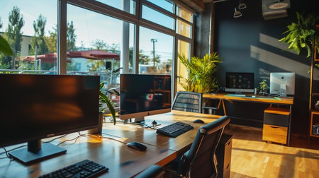 Stylish modern coworking room interior with pc computers on desk, panoramic window