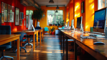 This vibrant office environment showcases a row of desks equipped with sleek computers. Colorful chairs in orange and teal add a lively touch to the workspace, enhancing creativity and collaboration.