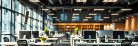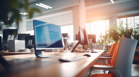 Blurred background, Defocused. Company and Workplace Concept Sunlit Office Interior