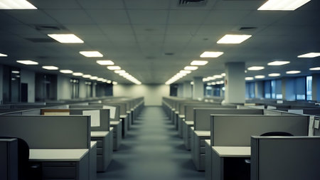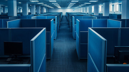 a row of empty office cubicles with computers and chairs, created with generative ai