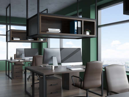 Modern workplace interior with pc monitors on desks in row, panoramic window