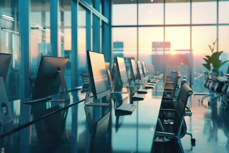 Modern office interior with rows of computers and large windows. Nobody inside